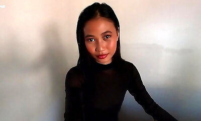 Asian in a sheer ebony dress flashing tits and pussy